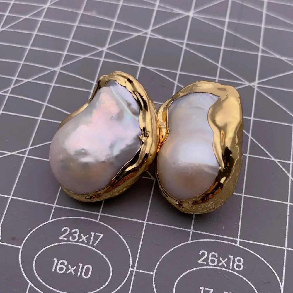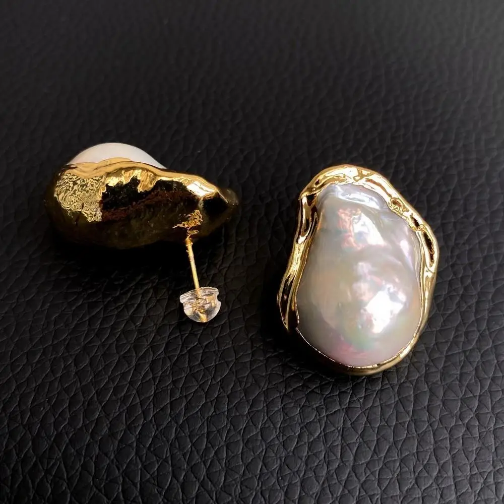 KKGEM 21x28mm Natural Cultured White Keshi Baroque Pearl Gold Plated Stud Earrings